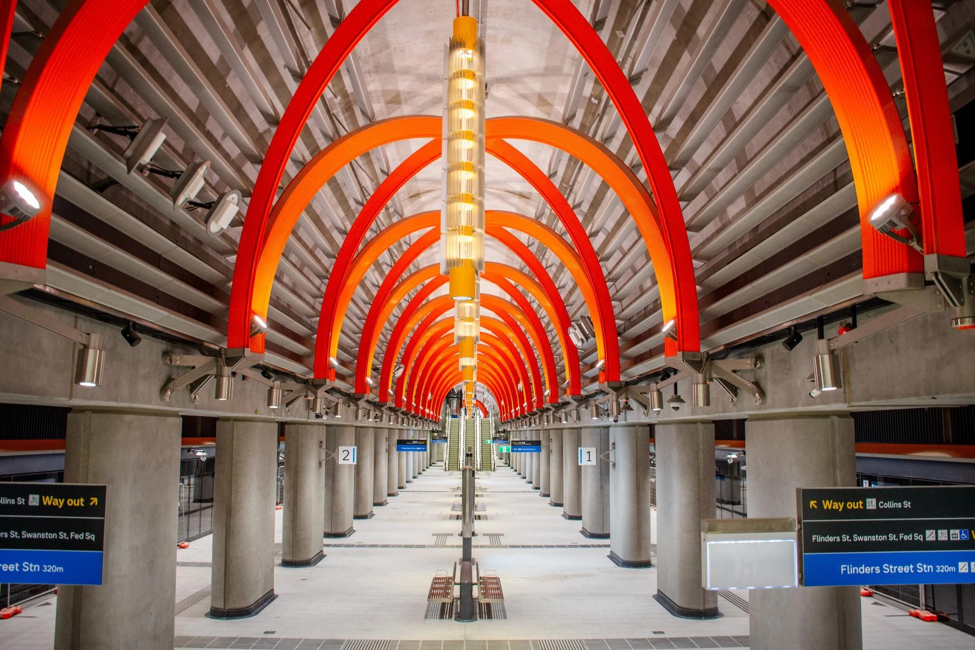 The 9-kilometre twin tunnels run through Melbourne’s city centre and serve five new metro stations (Arden, Parkville, State Library, Town Hall and Anzac). The Arden and Anzac stations feature monumental above-ground entrance structures designed to reflect the identity of the neighbourhood while bringing natural light to the underground concourses.
