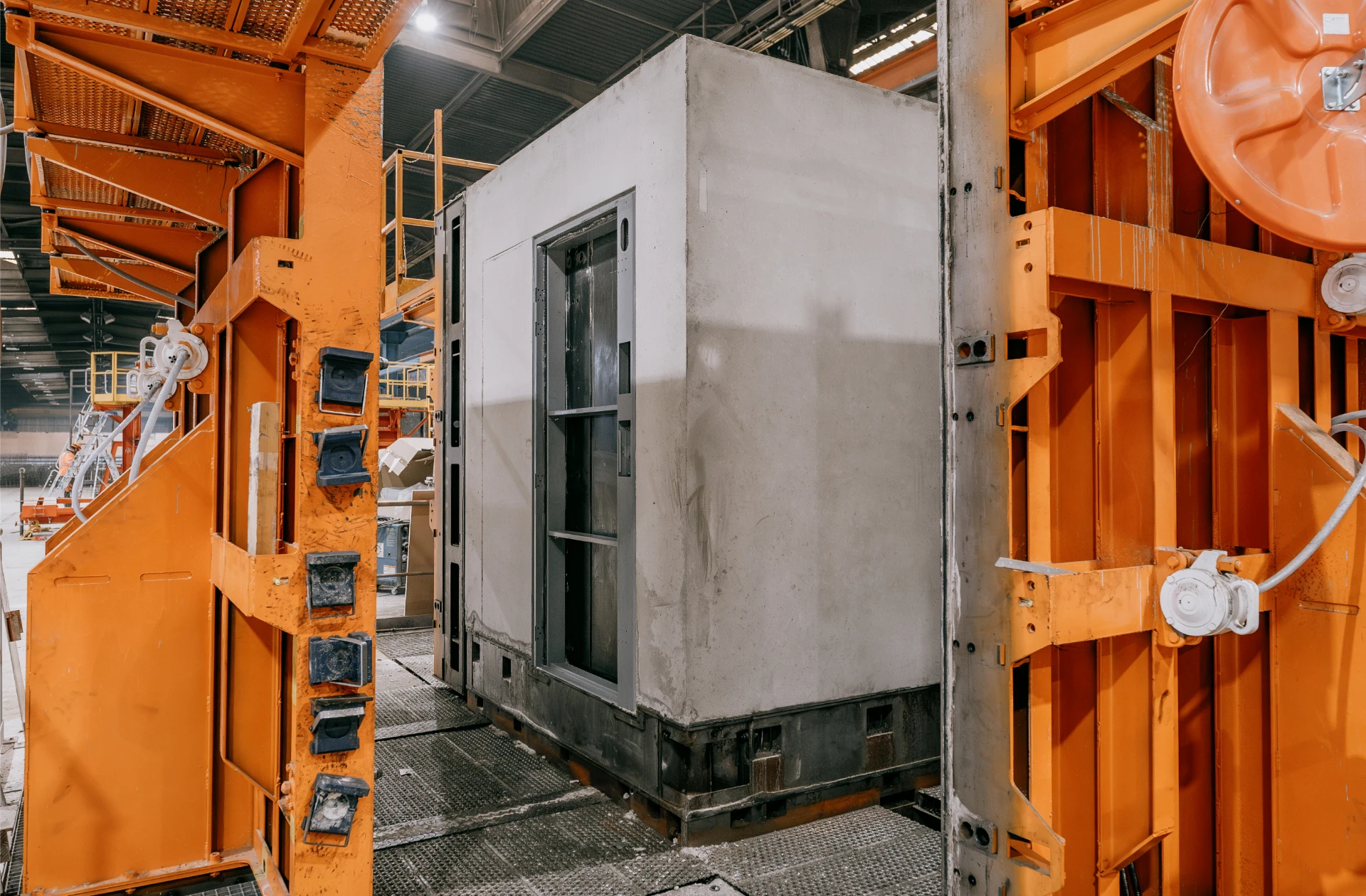 A large, light grey concrete module with a dark framed opening is central, flanked by vibrant orange industrial machinery in a factory for prefabrication.