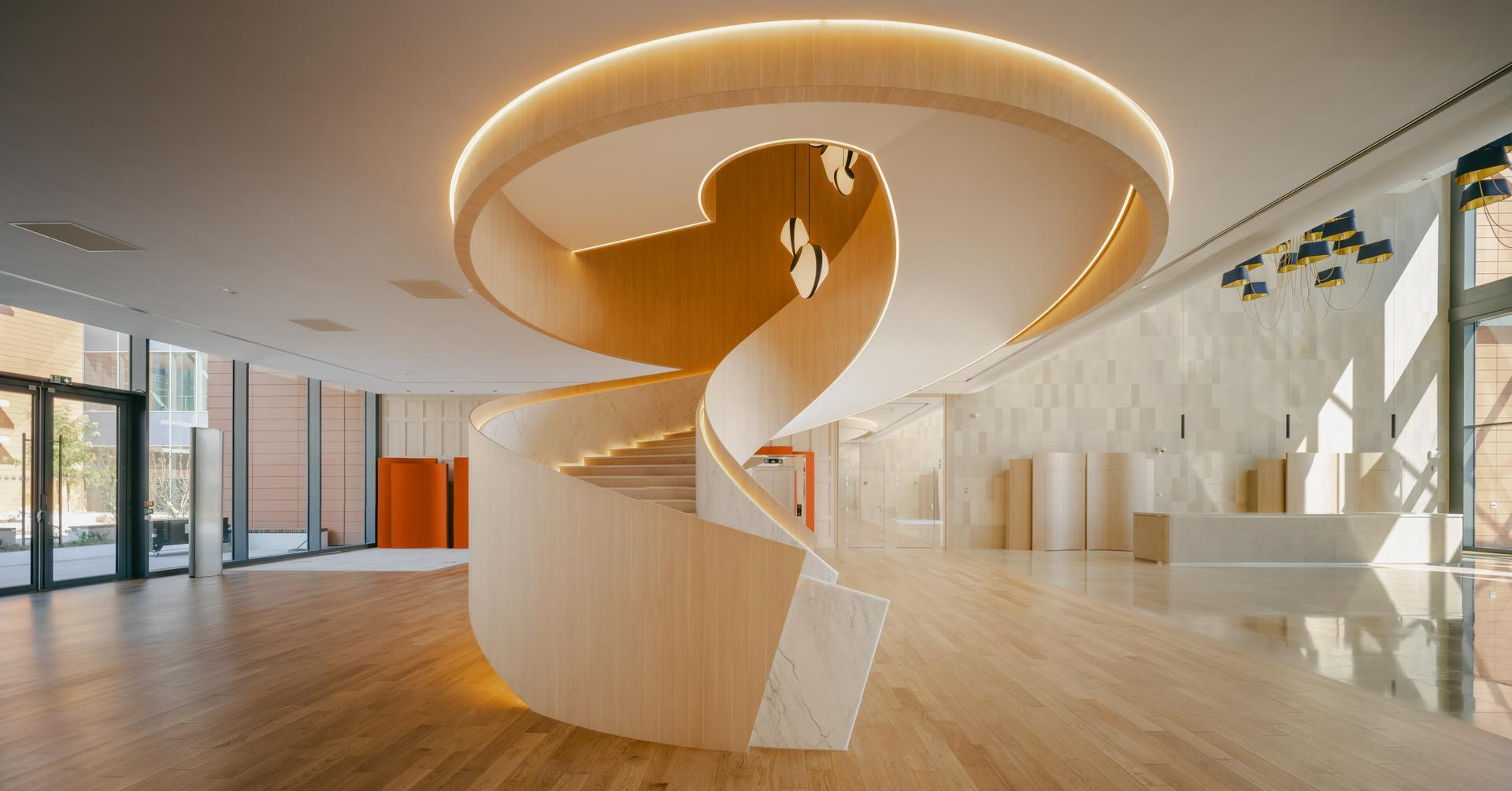 Une grande cage d'escalier en spirale moderne en bois clair et marbre blanc est au centre d'un hall spacieux et lumineux. L'éclairage LED intégré souligne ses courbes, complété par la lumière naturelle des fenêtres et des luminaires suspendus contemporains, dont des abat-jour bleu marine et or.