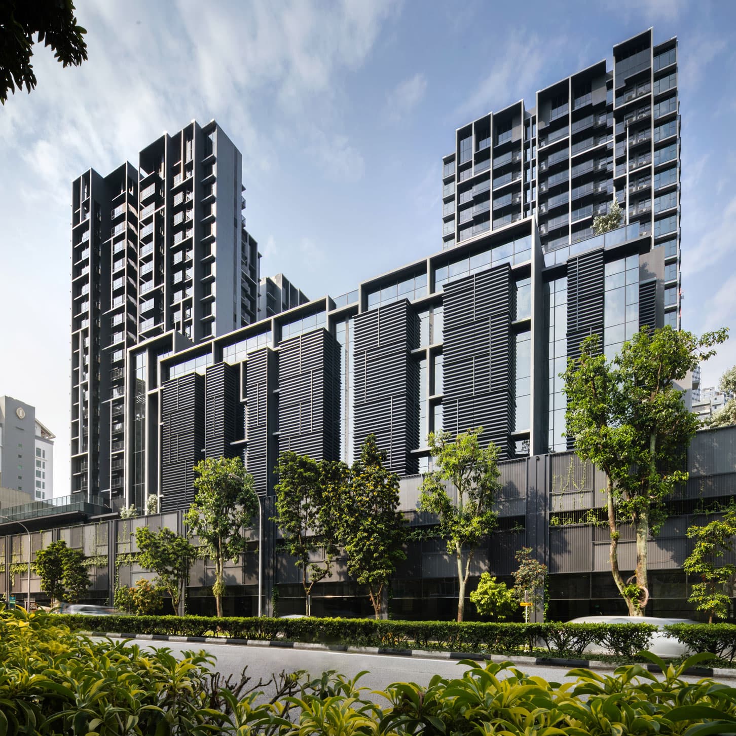 Vue de la rue d'un complexe moderne de gratte-ciel sombres et vitrés, présentant des balcons décalés et des façades inférieures avec des écrans horizontaux, entouré de végétation luxuriante le long d'une route urbaine sous un ciel bleu clair.