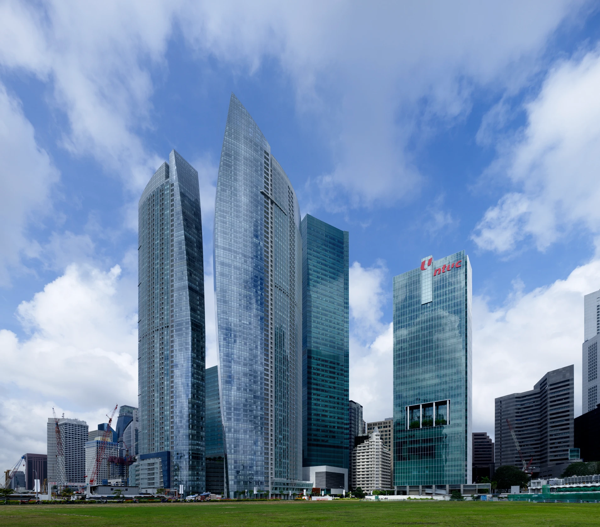 Des gratte-ciel modernes aux façades de verre bleuté s'élèvent au-dessus d'une pelouse verte, sous un ciel bleu lumineux parsemé de nuages blancs.
